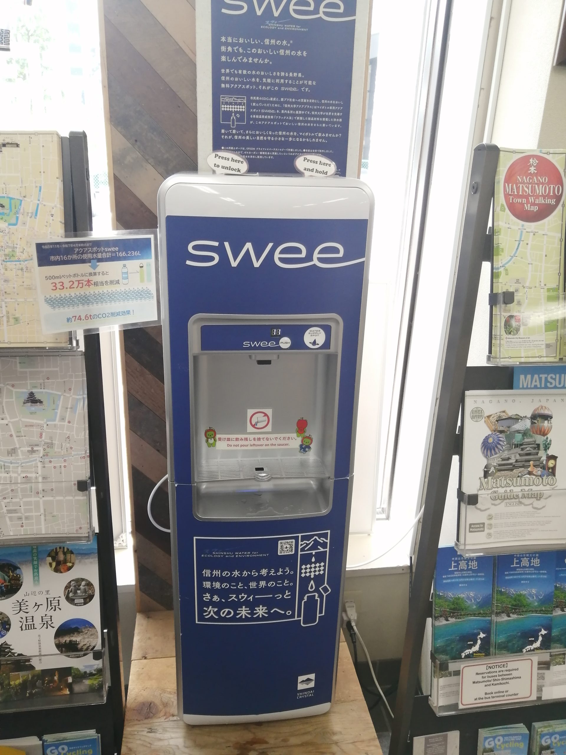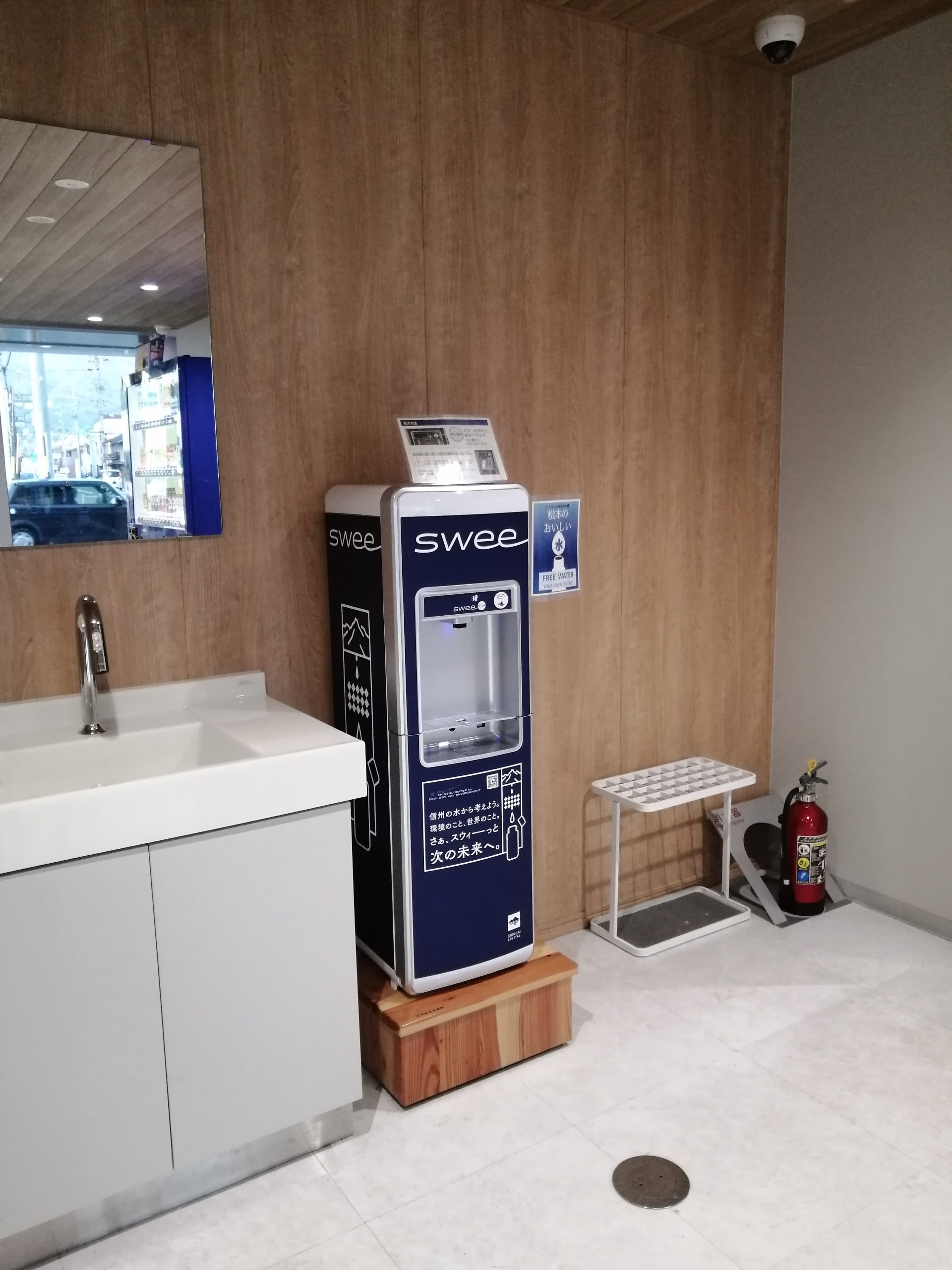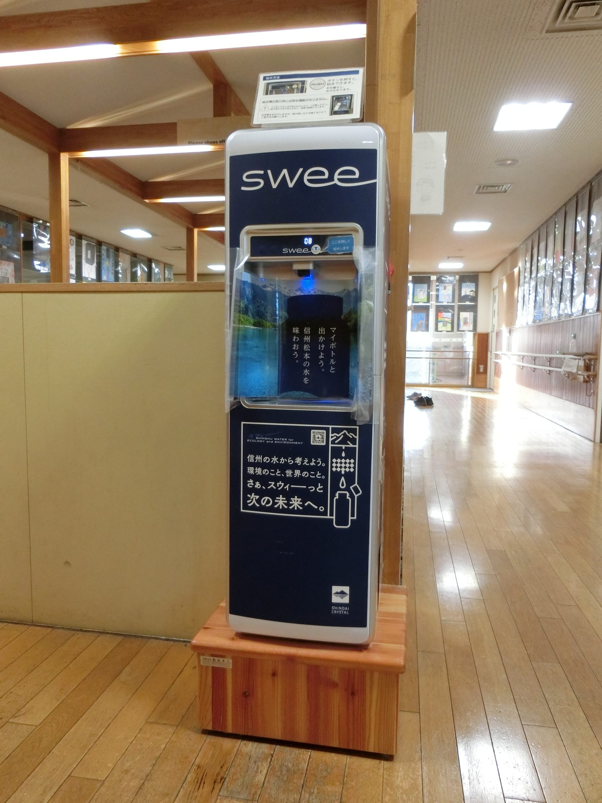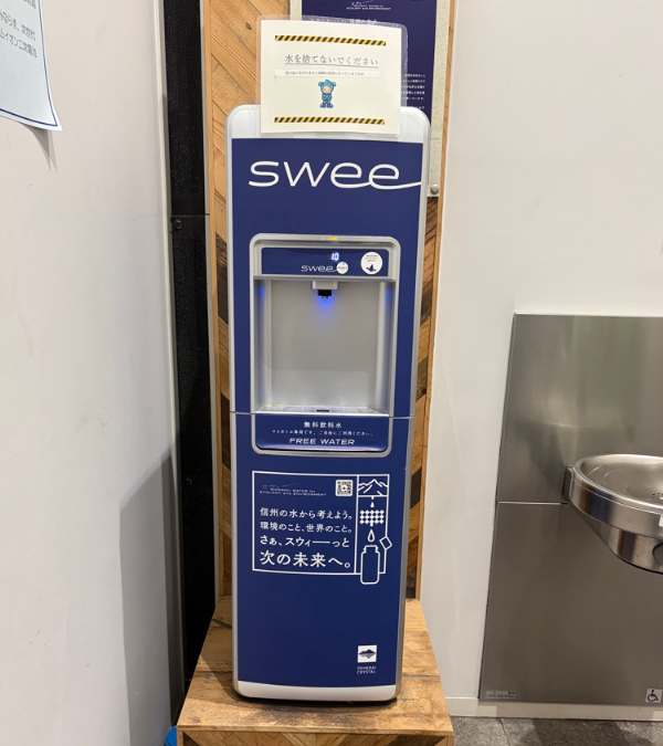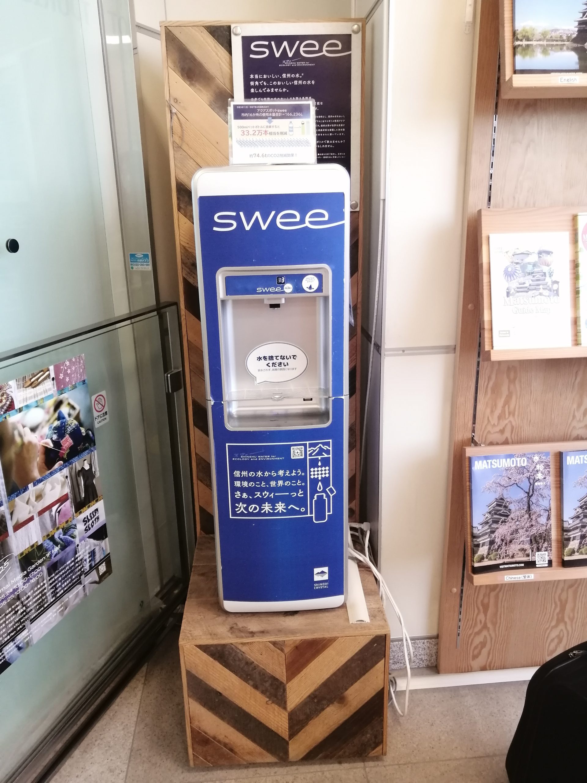 sweeは、Shinshu Water for Ecology and Environment の略で、信大クリスタルを使用したアクアスポット・マイボトル活動の総称です。市民・県民の方々、観光客の方々にSDGs達成やPETボトルの削減・脱プラ社会への貢献を考えて頂ける場、信州の水をおいしく飲んでいただく場として、マイボトル専用アクアスポットsweeを県内各所に展開しています。